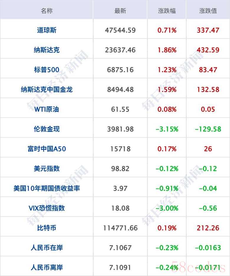美股三大指数集体收涨,均续创新高,纳指涨1.86%,标普500指数涨1.23%,道指涨0.71%;高通涨超11%,创2024年7月以来新高;特斯拉涨超4%,谷歌、英特尔涨超3%,苹果、英伟达涨逾2%,亚马逊、Meta涨逾1%;奈飞微跌,其中,苹果、谷歌均再创新高,苹果总市值逼近4万亿美元。纳斯达克中国金龙指数涨1.59%,中概股集体上涨;小鹏汽车、小马智行涨超6%,百度涨近5%,金山云涨超4%,京东、爱奇艺涨超3%,阿里巴巴涨近3%。