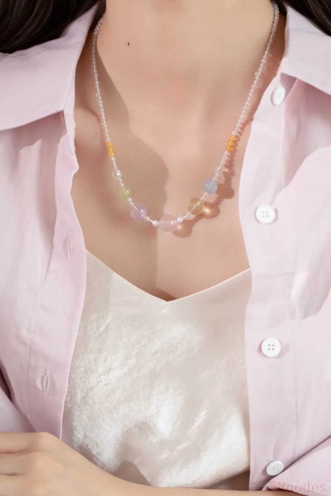加入小巧玲珑的蔷薇石、蜜蜡等色彩搭配,就像一杯纯水里加入了五彩缤纷的糖果,瞬间甜起来了,美好也将如期而至。