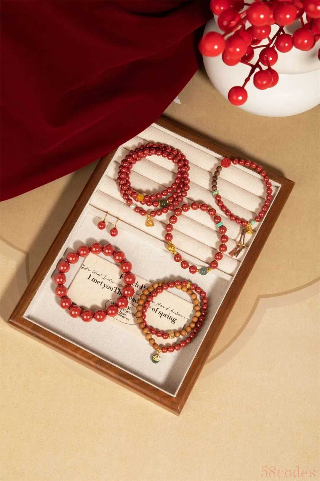 中间点缀一颗红色南红玛瑙桃心,点亮手串色彩,爱意浓郁。