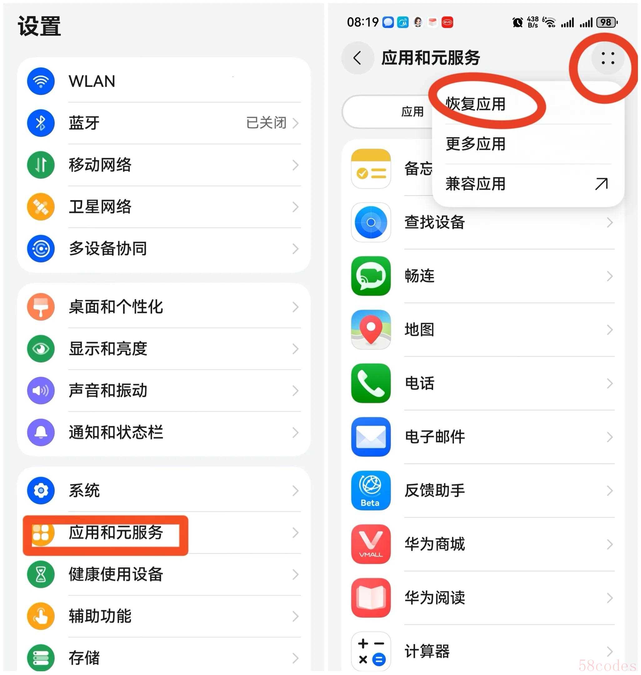 如果上述办法还无法恢复已经被隐藏的图标,可以点击“设置”选择“应用和元服务”,点击右上角符号,再选择“恢复应用”即可找到被隐藏的应用,按提示操作,即可将图标恢复到桌面。恢复完以后可重复上面查找APP的操作,就能快速找到图标所在的位置。在这里还有个兼容应用,里面可以看到用卓易通和出境易下载的APP。