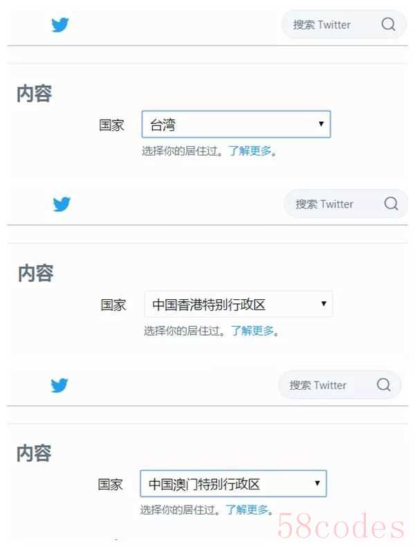 在推特中文版网页中,虽然香港、澳门分别被写为“中国香港特别行政区”、“中国澳门特别行政区”,但二者还是被列入“国家”一栏。
