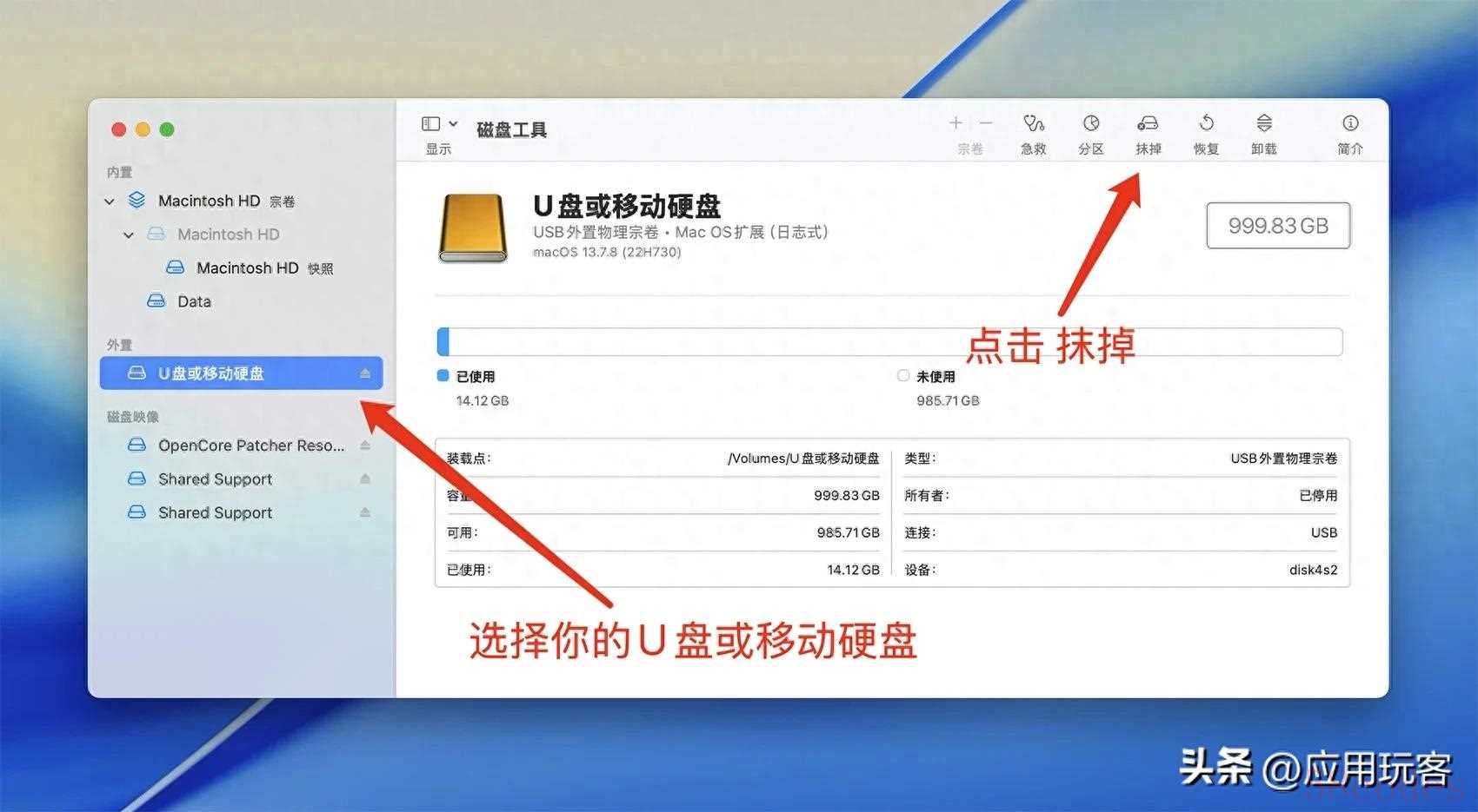 1、找一个大于 16 GB 的U盘/移动硬盘,将里面的数据备份,然后电脑内搜索 磁盘工具 并打开,选择你的U盘/移动硬盘后点击 抹掉 按钮;