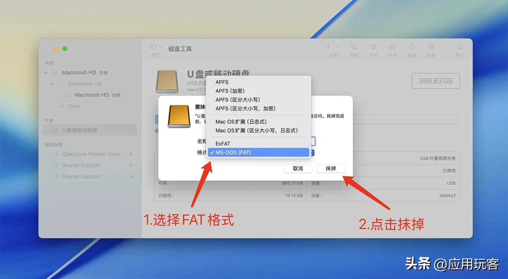 2、选择 FAT 格式然后点击 抹掉 即可;
