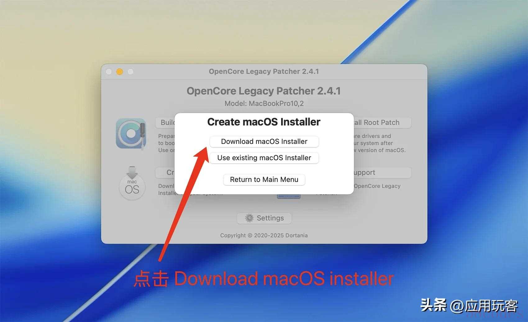 6、macOS 系统下载完后 点击底部 Return to Main Menu 返回 OpenCore Patcher 主界面,然后点击 Create macOS Installer 按钮;