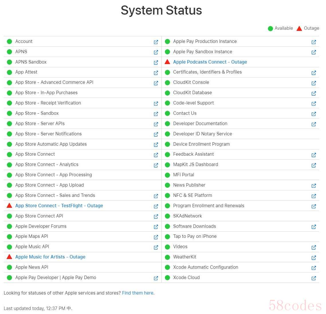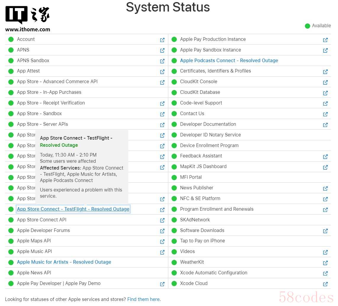 苹果系统状态页面显示,今日 11:30 开始,App Store Connect - TestFlight、Apple Music for Artists、Apple Podcasts Connect三项服务出现故障,部分用户受到影响。