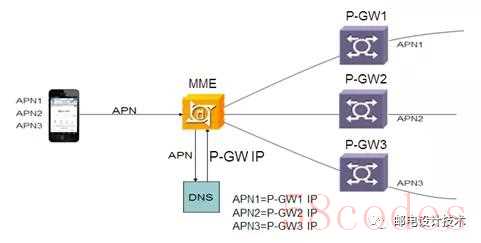 如图所示,手机在“附着”请求流程中,上报手机上设置的APN(APN的NI部分),MME收到手机上报的APN后,根据手机IMSI构造成FQDN格式,然后送至DNS查询(注意这个DNS不是互联网上的DNS,而是移动网内专用的DNS,只负责EPS网元之间的主机名或域名解析),DNS当中存储有APN的FQDN格式域名和P-GW网关IP地址之间的对应关系,这样通过查询DNS,MME便可以获得P-GW网关的IP地址,其后便可以决定手机通过哪种接入方式来访问网络(选择不同的P-GW便决定了手机采用哪种接入方式来访问网络)。