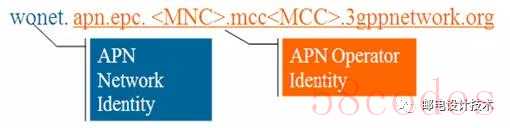 完整的APN包括2部分:网络标识(APN Network Identity)部分和运营商标识(APN OperatorIdentity)部分,格式为****. apn.epc.<MNC>.mcc<MCC>.3gppnetwork.org,APN这种格式称为FQDN格式,其中网络标识部分由运营商“自己定义”,运营商标识部分为固定扩展(根据电信运营商手机卡IMSI当中的MNC和MCC映射扩展)。