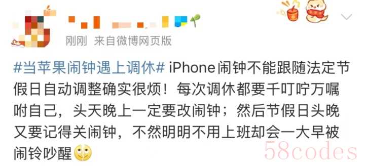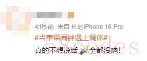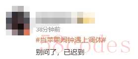 不少网友吐槽“今天的调休在苹果那儿是不算工作日的,这么多闹钟它愣是没响一个”“当苹果闹钟遇上调休估计会有很多人迟到吧!”