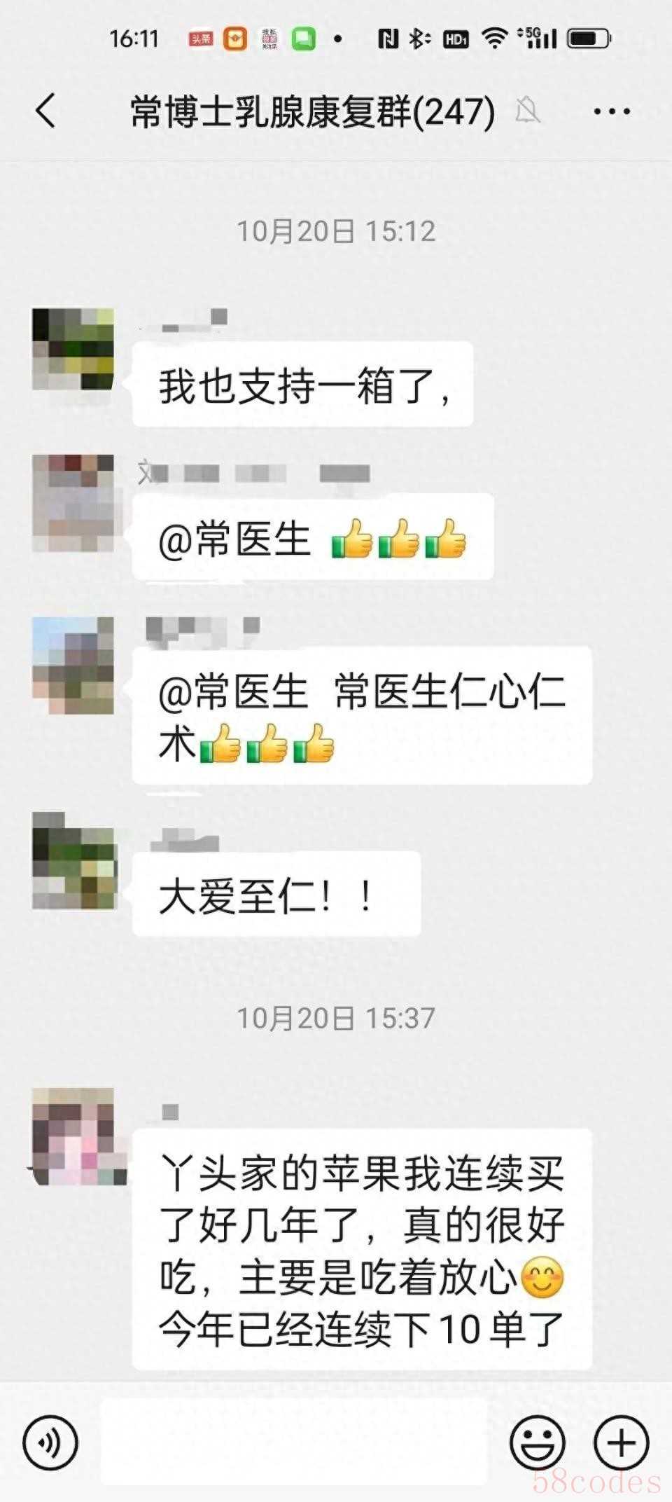 没想到,简单的一句推荐得到了群里病友们的积极回应和热心相助——“丫头家的苹果我连续买了好几年了,真的很好吃,今年已经连续下好几单了。”“支持!”“我也买!”“我也支持一箱了。”有病友为常旭的善意推荐点赞,“真是千金难买的广告!”