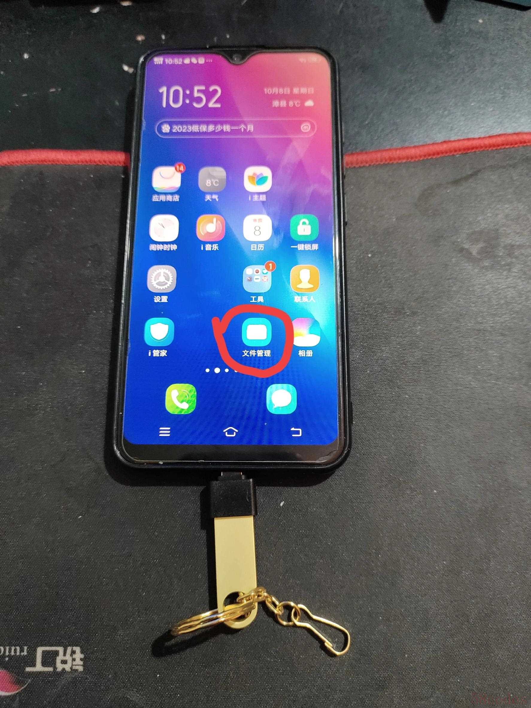 打开以后手机就可以识别到U盘,这时候就可以转存手机里的内容了,先在桌面找到文件管理。