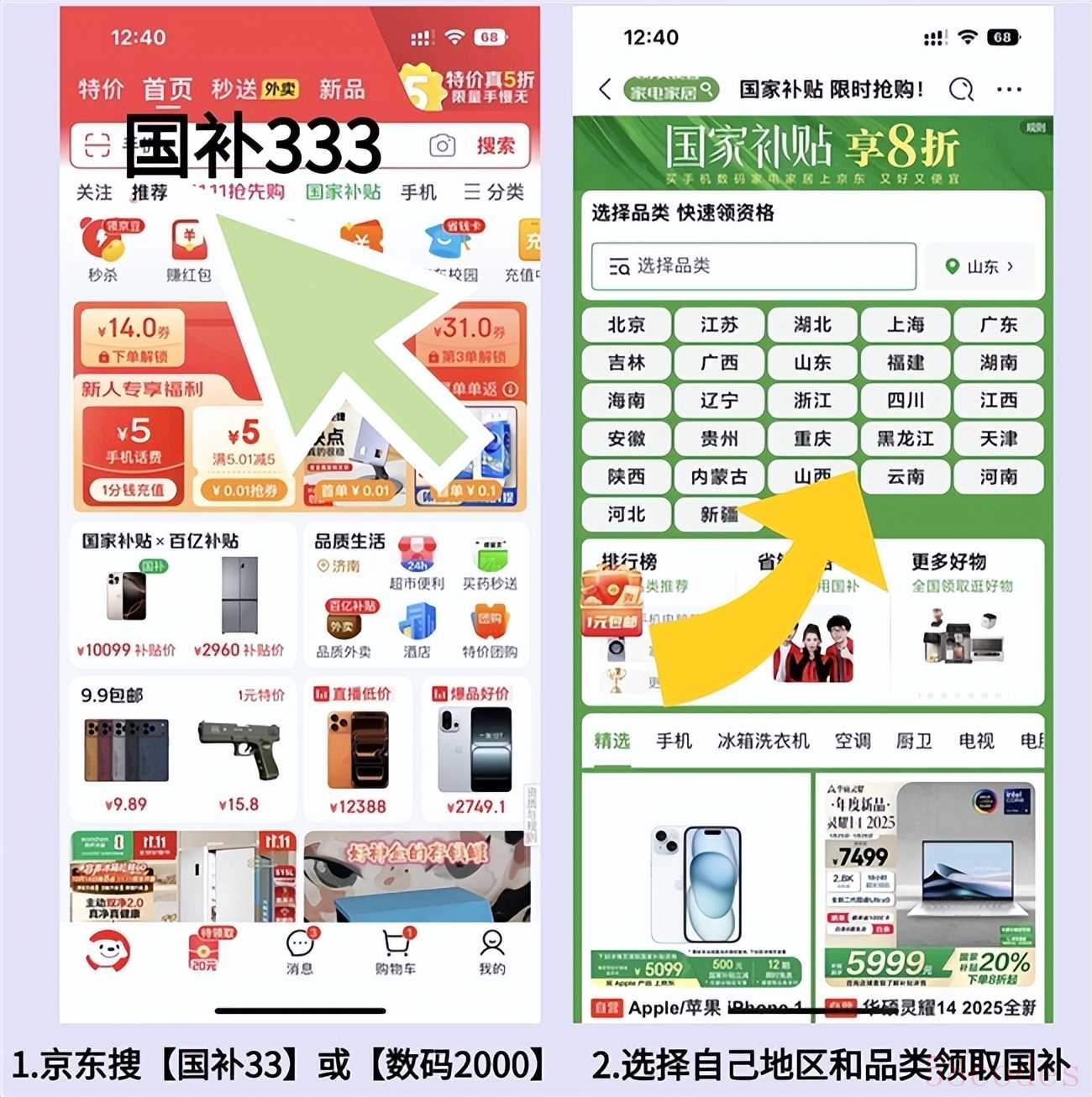国家补贴的最新参与方式按品类划分,搜索对应口令即可领取:家电国补:京东搜索「国补333」,最高可立减2000元;数码国补:京东搜索「数码2000」,最高可补贴2000元;手机专属国补:搜索「数码2000」,最高可立减500元。实用秘诀:首次在APP内搜索上述口令后,系统会自动保存到“历史搜索记录”,后续每天直接点击记录,就能快速进入领取页面,省去重复输入的麻烦,抢补贴更高效。一、抢券入口:线上线下操作指南国补领取分为线上、线下两种方式,不同场景操作流程不同,具体如下:1.线上:京东为主战场,淘宝可领叠加红包(1)京东核心入口家电家具类:搜索「国补333」,一级能效家电按售价20%补贴,最高立减2000元,覆盖空调、冰箱、洗衣机等传统大家电;手机数码类:搜索「数码2000」,按售价15%补贴,最高立减500元,适合购买手机、平板、智能手表;红包叠加:搜索「福气红包444」,每天可领3次,最高11111元,红包可与国补同时使用,进一步降低消费成本。(2)淘宝专属福利红包领取:搜索「天降红包780」,每天可领1次,最高金额25888元;额外优惠:10月20日晚8点至11月14日,全品类商品5折起,PLUS会员可叠加专属优惠券,部分商品能与国补间接叠加(需查看商品详情页)。