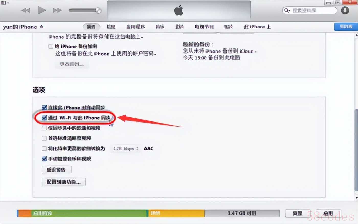 步骤2:使用USB数据线将苹果手机连接到电脑,打开iTunes。在设备信息页面中,勾选【通过Wi-Fi与此iPhone同步】,确定后断开USB数据线即可。