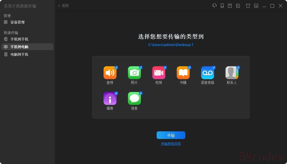 注意:「手机到电脑」模式是批量传输文件,如果你想选择性传输文件,请选择「设备管理」模式。