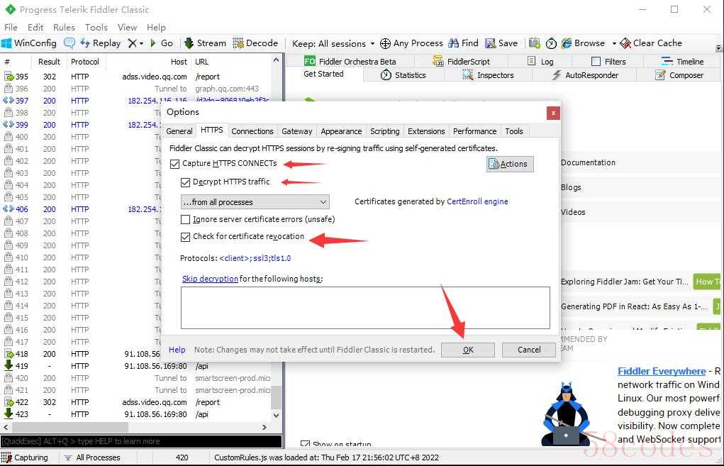 4、然后我们打开下载安装好的 Fiddler4 网络抓包调试工具,进行配置安装 HTTPS 证书,点击“Tools”选择“Options…”,进入后选择“HTTPS”,勾选“Decrypt HTTPS traffic”,弹出 HTTPS 证书安装提示,YES,全部选择是,如下图: