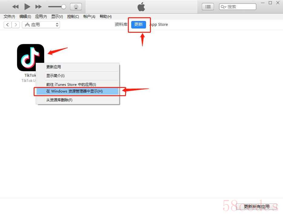 10、下载完成后,在 iTunes 更新选项内,右键 TikTok 图标,选择在 Windows 资源管理器中显示,然后我们将其复制到桌面,文件名为:TikTok 21.1.0.ipa,如下图:
