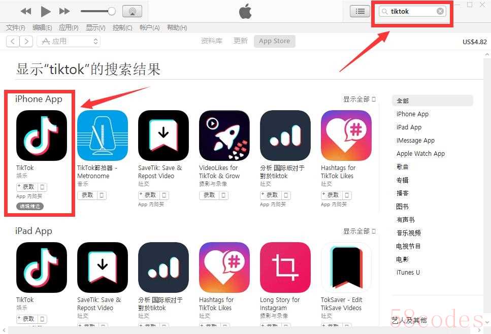 3、然后我们在 iTunes 界面右上角的搜索框搜索“tiktok”,搜索出来不要着急点击 获取 或者 下载,切记,如下图:
