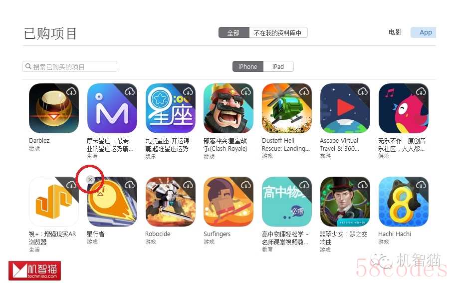 方法类似,在右上角点击自己的头像,然后选择“已购项目”,在“我的应用”标签中可以看到此前购买过的APP,只需将鼠标移动到APP图标上,然后点击左上角的×就可以隐藏。隐藏后并不影响购买记录,付费之后的APP仍然可以免费下载的。