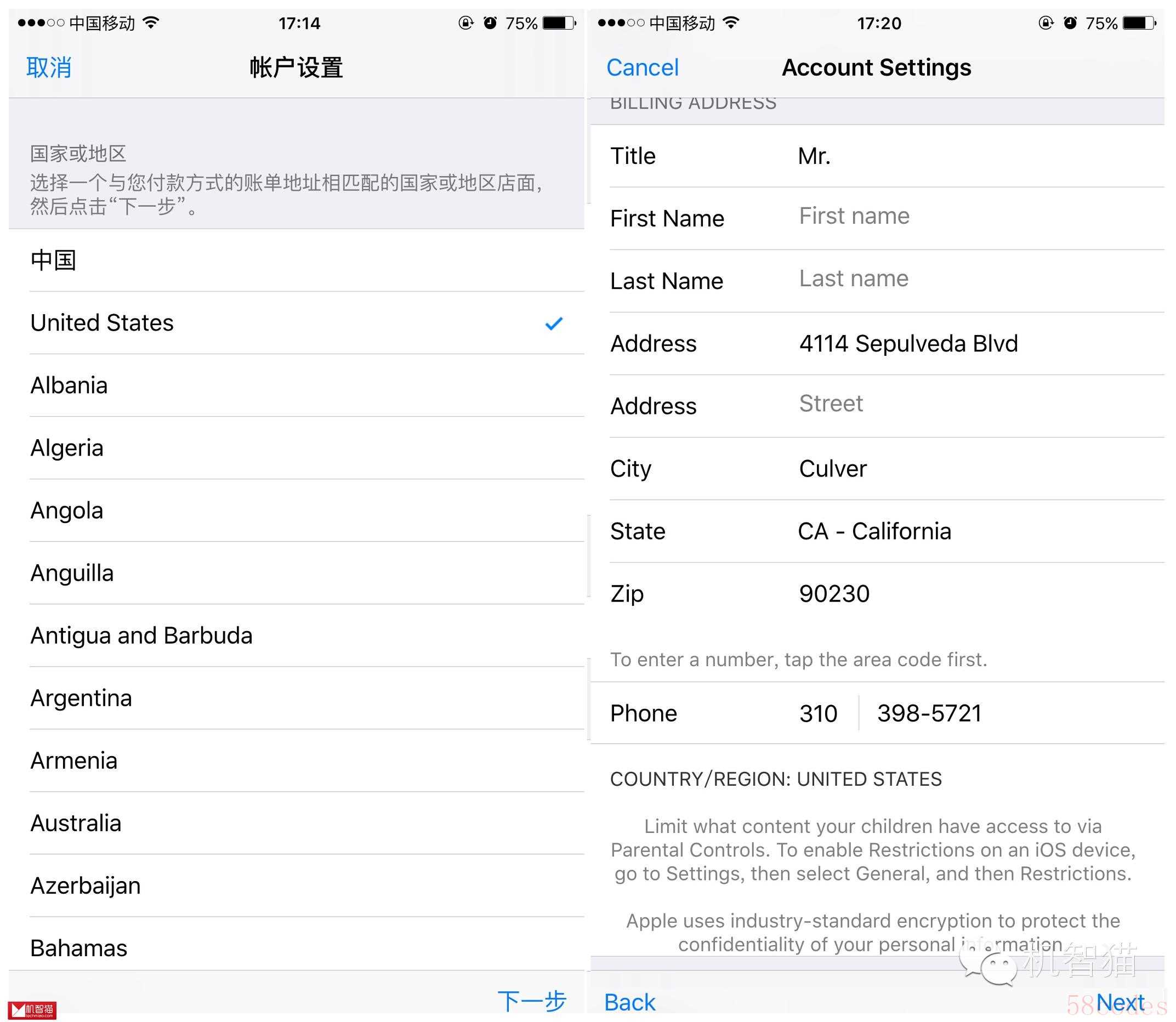 接下来用手机打开APP Store,拖到底部注销自己此前登录过的账号,然后重新登录新账号,接下来会要求验证,在这里一定要选择United States,接下来在Billing information中要选择“None”,否则会要求填写信用卡信息。而在Address(地址)中,一定要填写真实的美国地址,随便上网搜一个或者抄我的就行。确认后APP Store就会自动切换到美区,并且变成全英文界面。