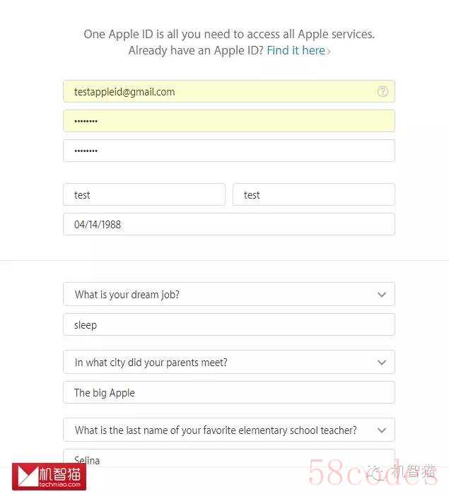 https://appleid.apple.com/us/)点击右上角的“Create Your Apple ID”进行注册。