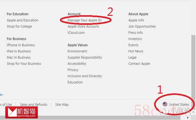 首先打开苹果官网(www.apple.com),拖动页面到底部,可以看到右下角的国旗,点击后选择美国(United States),然后点击底部的“Manage Your Apple ID”,在弹出的新页面中(