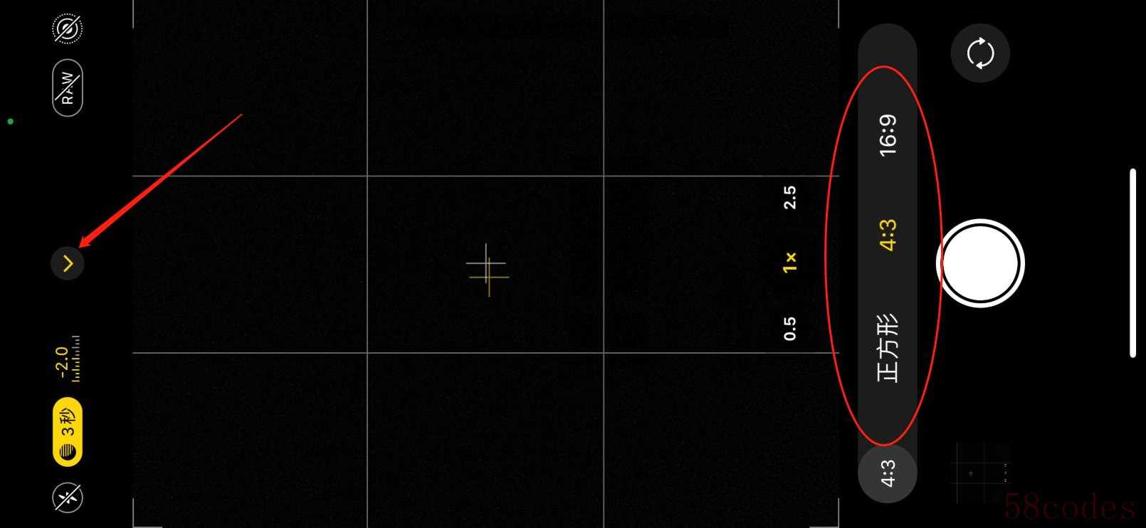 画幅中可以选择拍摄照片的长宽比,手机默认的是4:3。点击拍摄界面中的箭头,再点击4:3就可以调整比例了。苹果手机中除了4:3之外还可以选择正方形和16:9。