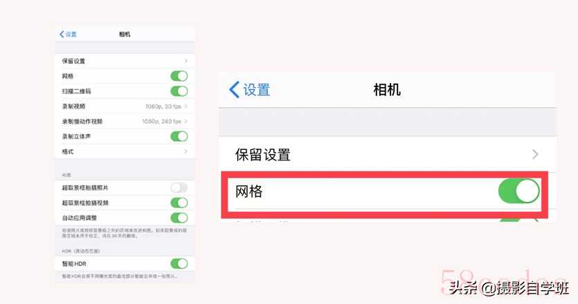 1、打开手机设置-相机,进入相机设置页面之后,首先打开网格线。网格线可以帮助我们在拍摄的时候找准水平线,横平竖直,更利于我们构图。