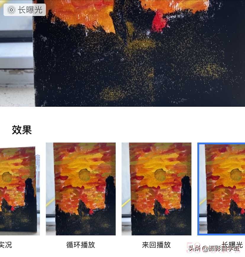最后一个按钮是实况,实况下拍摄的照片,可动态可静态,我们在实况模式下拍摄完照片之后,可在相册中,找到照片,向上滑动照片,会有实况、循环播放、来回播放、长曝光等效果供你选择