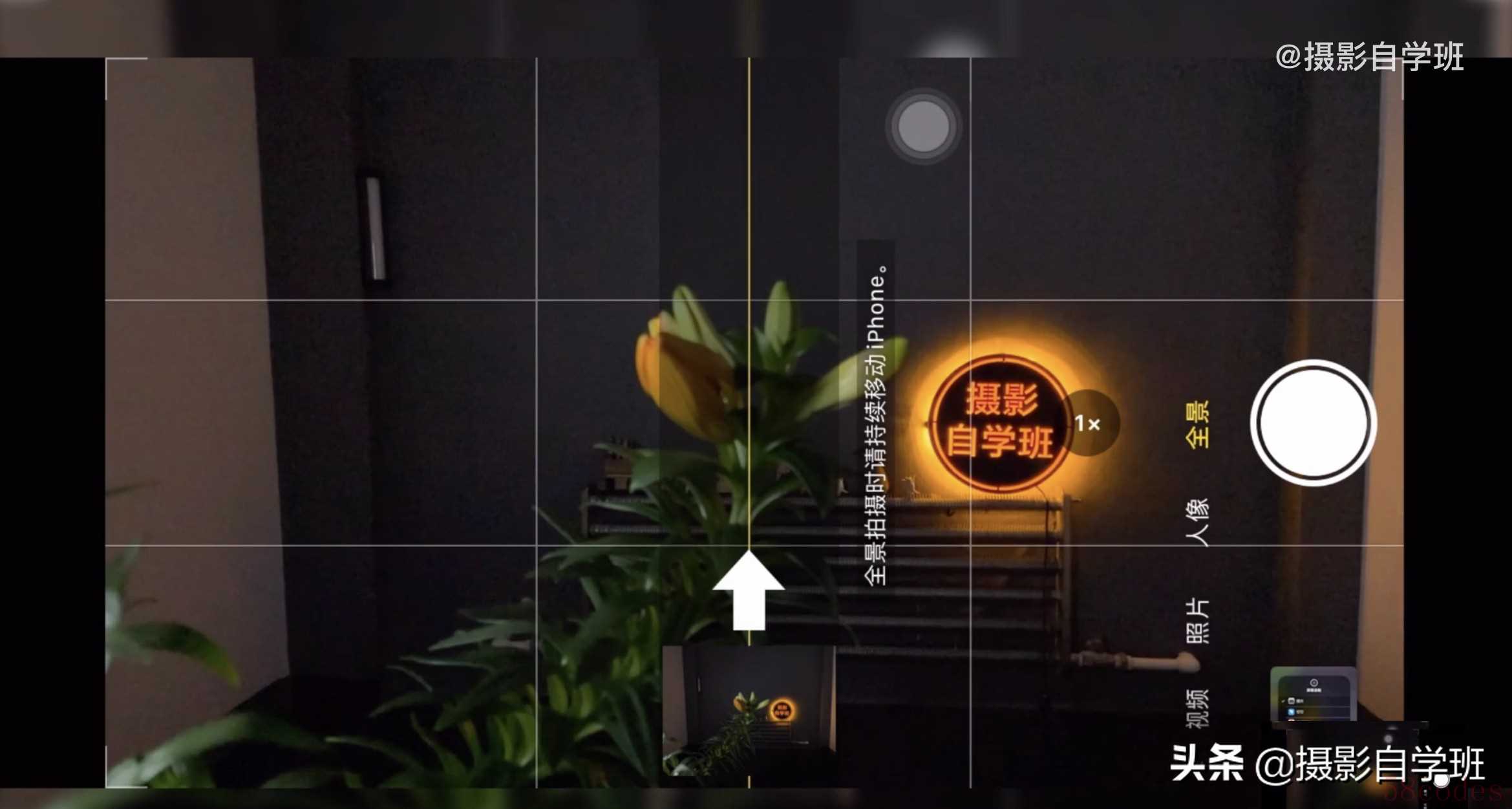 最后全景模式拍摄,全景需要移动拍摄,才会把画面拍摄完整,注意保持画面平衡,按照箭头指示拍摄即可。