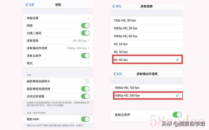 视频的设置和前面的延时摄影慢动作,基本上调整的参数都是一致的,分别有4k/高清的画面,和30/60的帧率。数值高的画面清晰,视频连贯性好。