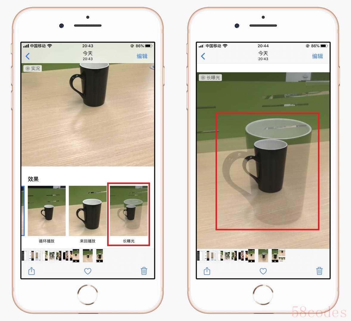 接着打开这张照片,向上滑动,从效果中选择【长曝光】,你将会得到一张双重阴影的照片,如果拍摄的是人物,那么将会的得到一张分身照哦。
