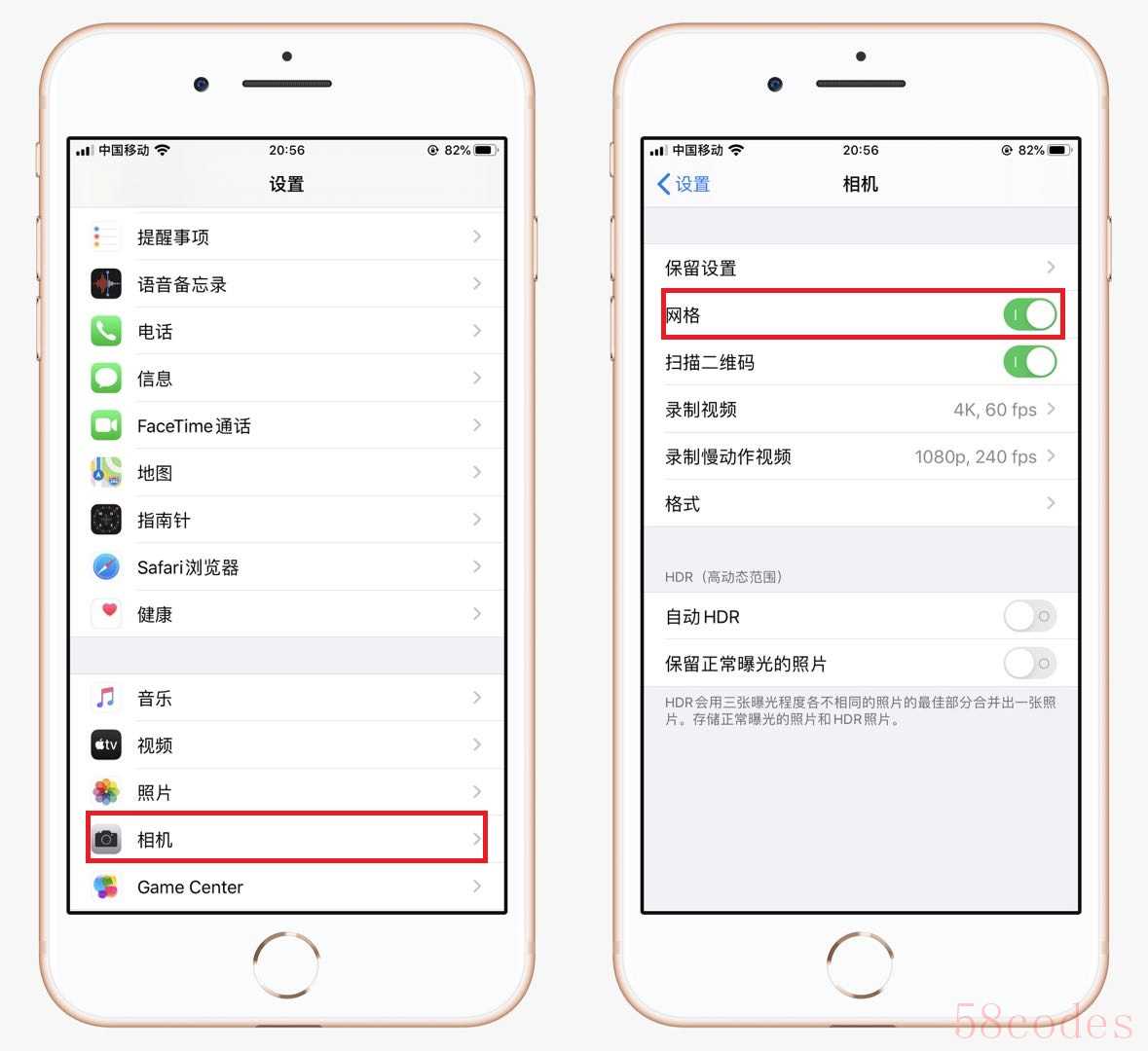 如果你的相机中没有网格线,需要打开手机的【设置】,找到【相机】选项,然后点击开启网格,以后在拍照时,屏幕上就会显示网格线了。