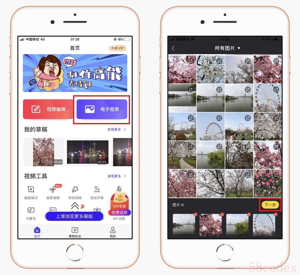 打开这个工具后,在首页有一个【电子相册】功能,我们点击它,从手机相册中连续选择照片,然后点击【下一步】。