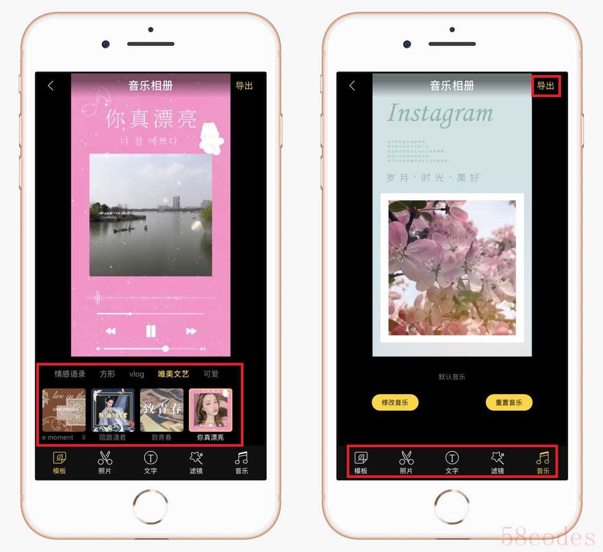 这时照片就自动变成音乐相册了,从这里选择不同类型的模板,还可以添加文字、滤镜、背景音乐,最后点击【导出】。