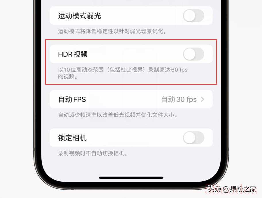 至于视频的话,则是要打开设置--相机--录制视频--将「HDR视频」关闭,这样我们用iPhone拍摄出来的视频就不会自动变亮了。
