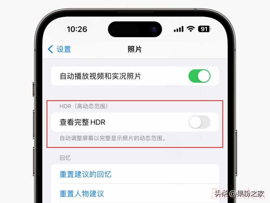 知道了问题的所在,我们就可以对症下药了,如果你也觉得在iPhone相册中预览的照片太亮,我们可以打开设置--照片--找到「查看完整HDR」功能并将其关闭即可。