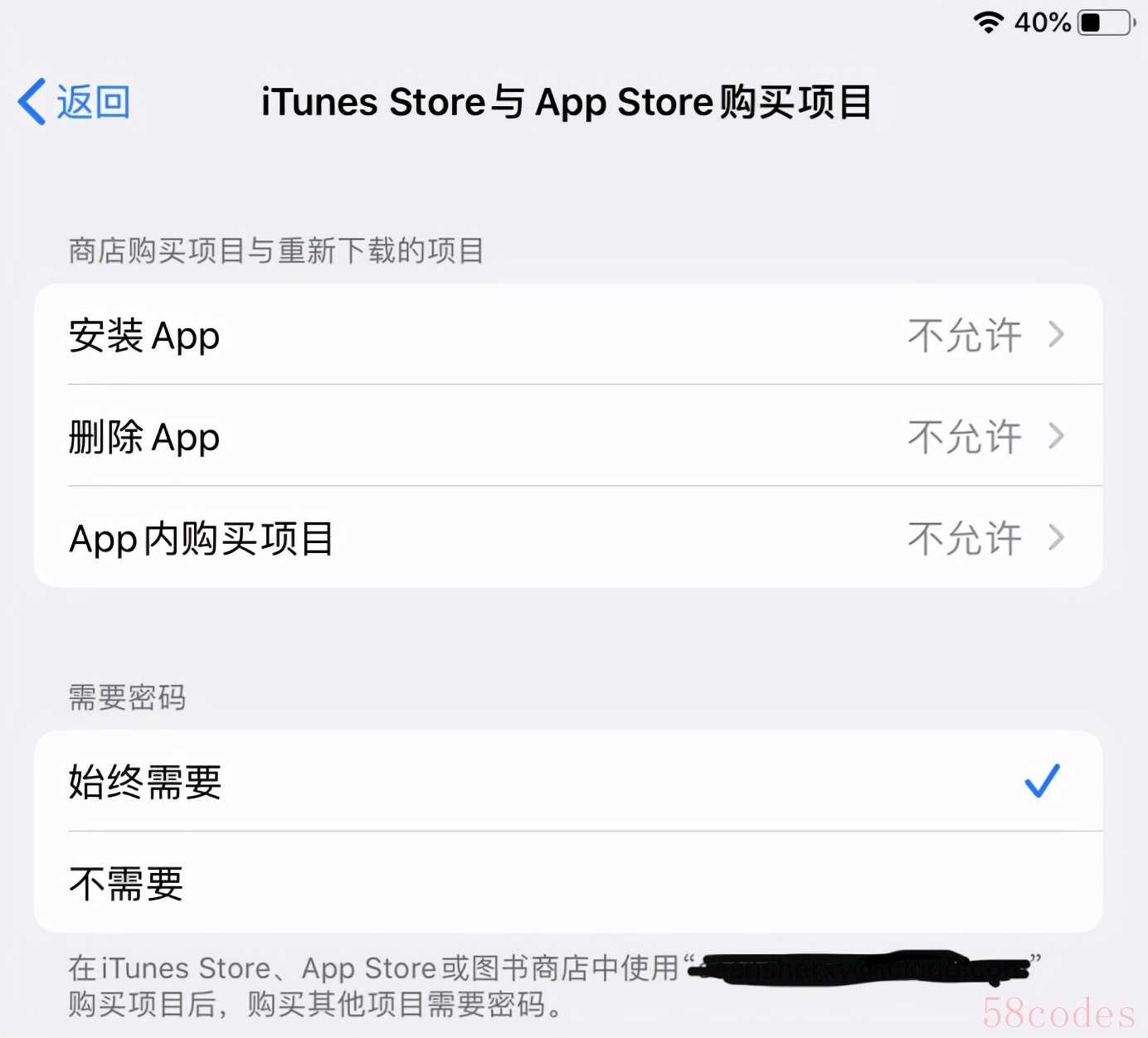 为了防止小朋友们“捣乱”,小媒君建议家长们提前进入“在iTunes Store或App Store上购买或下载项目”这个选项里,将“安装APP”“删除APP”“APP内购买项目”统统改成不允许,同时将“需要密码”这个选项设置为“始终需要”。