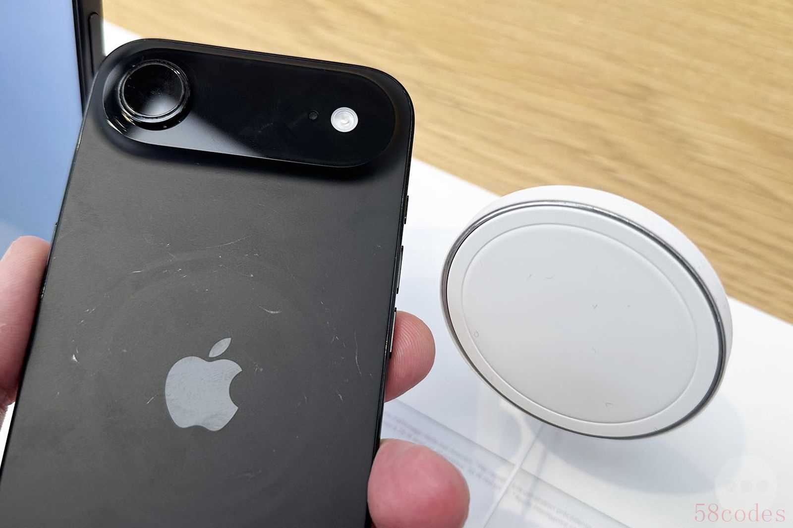 因此,苹果调整了店内展示用的 MagSafe 站架,通常是将支架的"宽度收窄",或者调整其结构,确保在放置 iPhone 17 时,手机边缘与支架之间有足够的空间,避免接触和划伤。