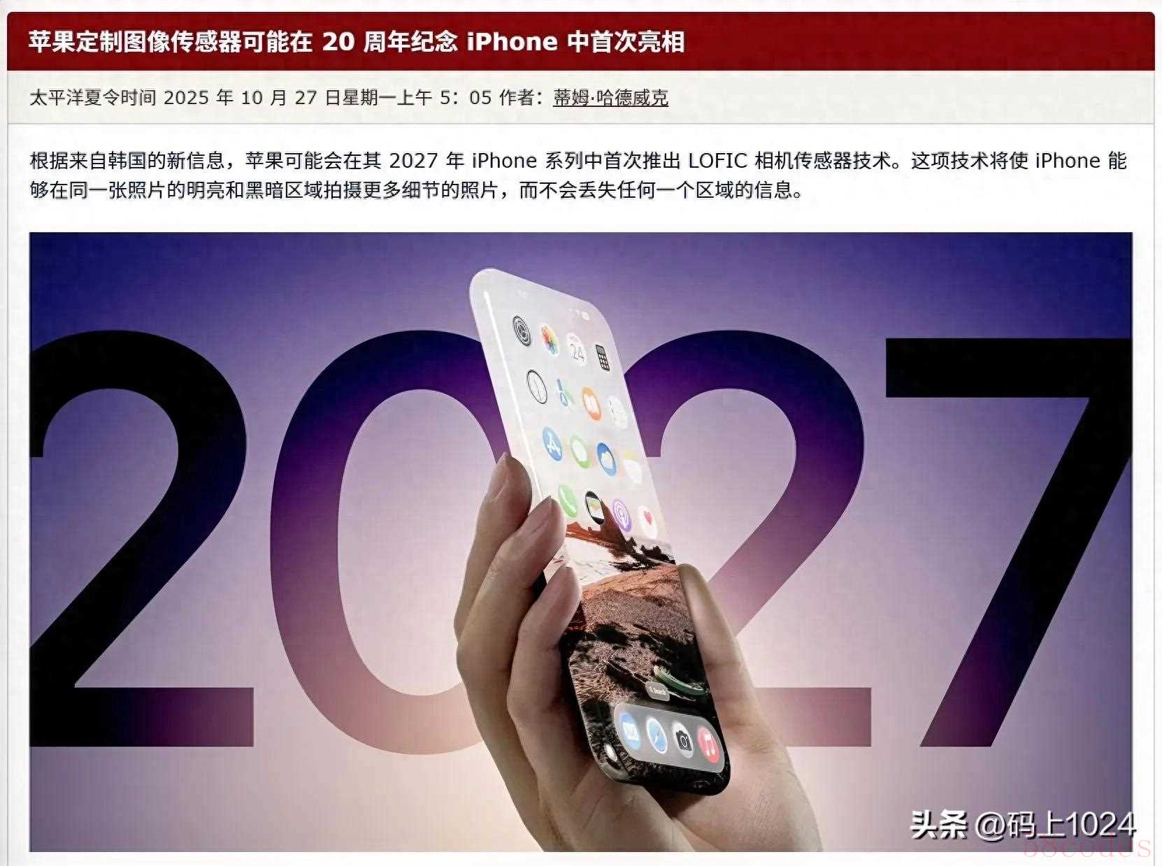 10月28日消息,据爆料人透露,苹果正秘密研发一项名为LOFIC的图像传感器技术,计划在2027年iPhone 20周年纪念款上首发。这项技术被业内称为“动态范围革命”,能让手机同时拍清极亮和极暗的细节,彻底告别过曝和死黑。