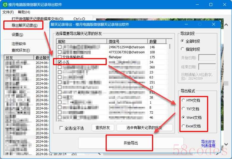 - 进入导出聊天记录窗口,可选择将记录导出为HTM, Word, TXT, Excel四种不同的文档格式。
