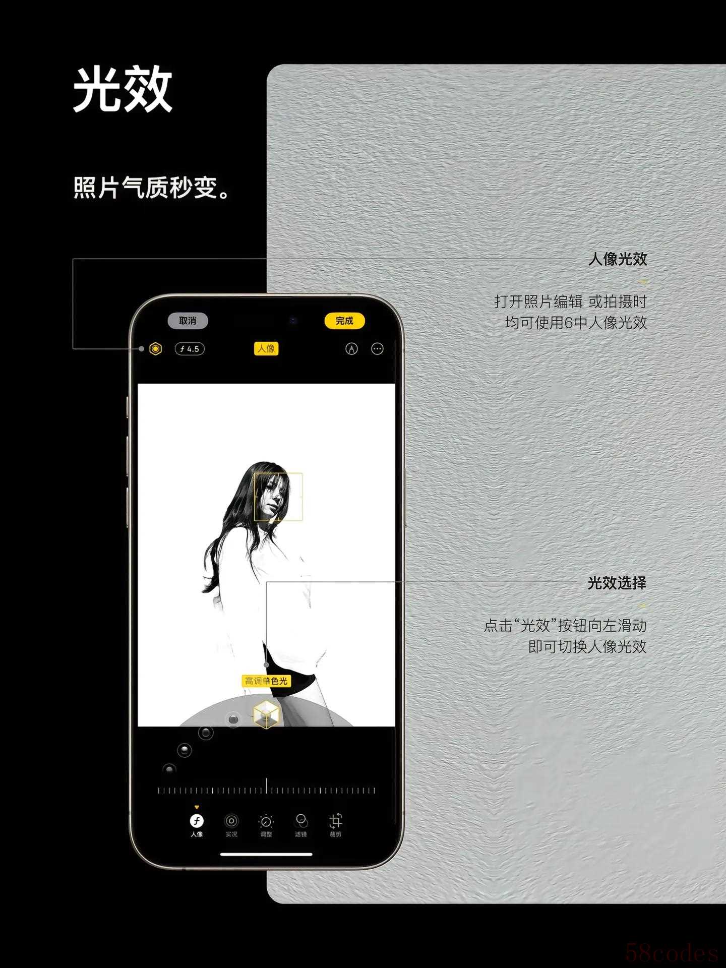 iPhone提供了多种人像光效模式,可根据需要选择: