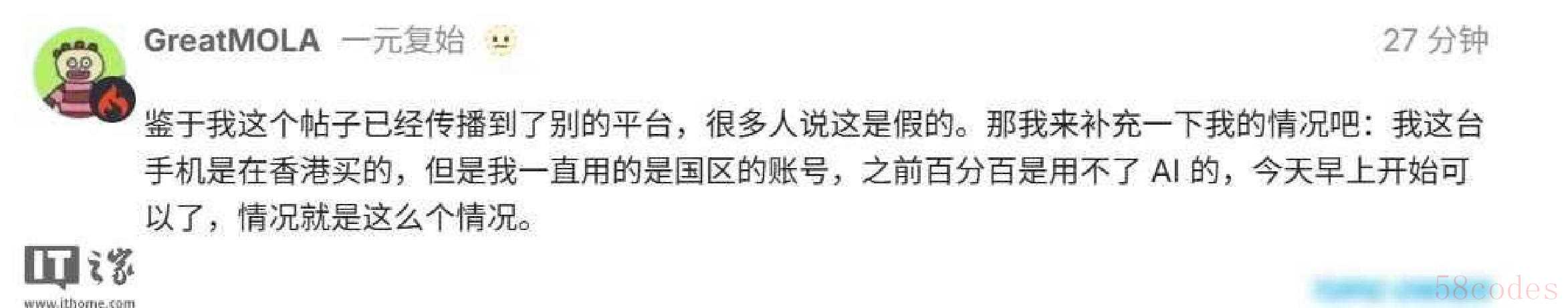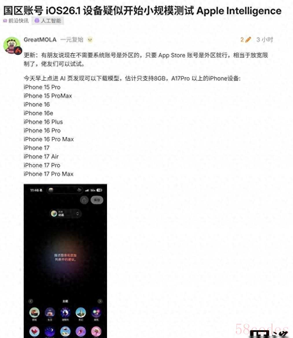发帖的是GreatMOLA。他说自己的手机系统没动,也没换设备账号,一直用的是国区的Apple ID,平时新功能根本打不开。那天忽然弹出一个安装提示,他点了同意,结果一整套新界面和体验都冒了出来。听起来像是后台某个开关被翻了,或者是验证的逻辑换了位置,总之体验一下子升级了。