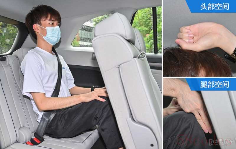 保持第二排不变,体验者坐进去第三排,此时头部空间剩余一拳,腿部空间剩余两指,虽谈不上宽敞,但满足短途出行场景完全没问题。