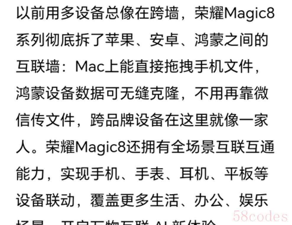 荣耀下个月15号要发新旗舰Magic8,他们说这次能连鸿蒙、安卓和苹果ios三个系统的设备。现在换手机传数据要微信或者电脑导,以后可以直接在mac电脑上拖文件到手机。之前华为和苹果系统互传一直卡着,这次荣耀说全解决了。