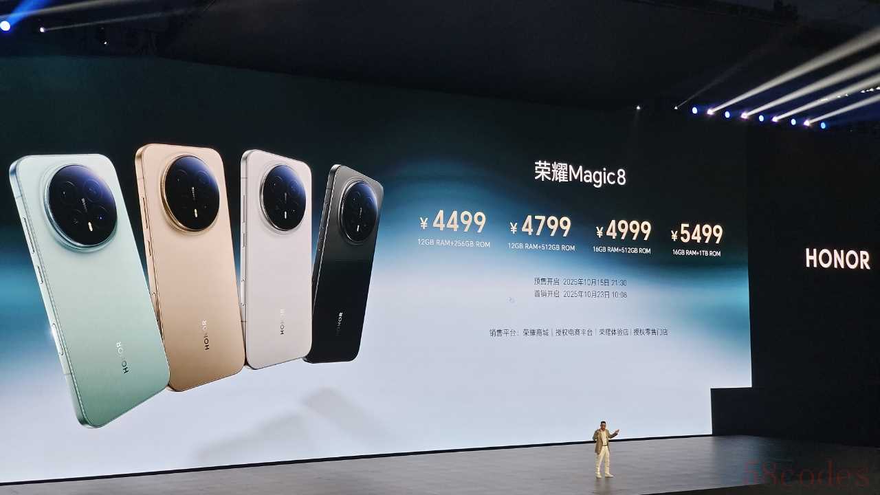 IT之家 10 月 15 日消息,荣耀正在举行“见新局・见未来”HGDC 发布会,推出 Magic 8 系列智能手机,搭载第五代骁龙 8 至尊版芯片,配合MagicOS 10 系统可实现多种 AI 功能,将在今晚 9 点半开启预售,10 月 23 日上午 10:08 正式开启开售。