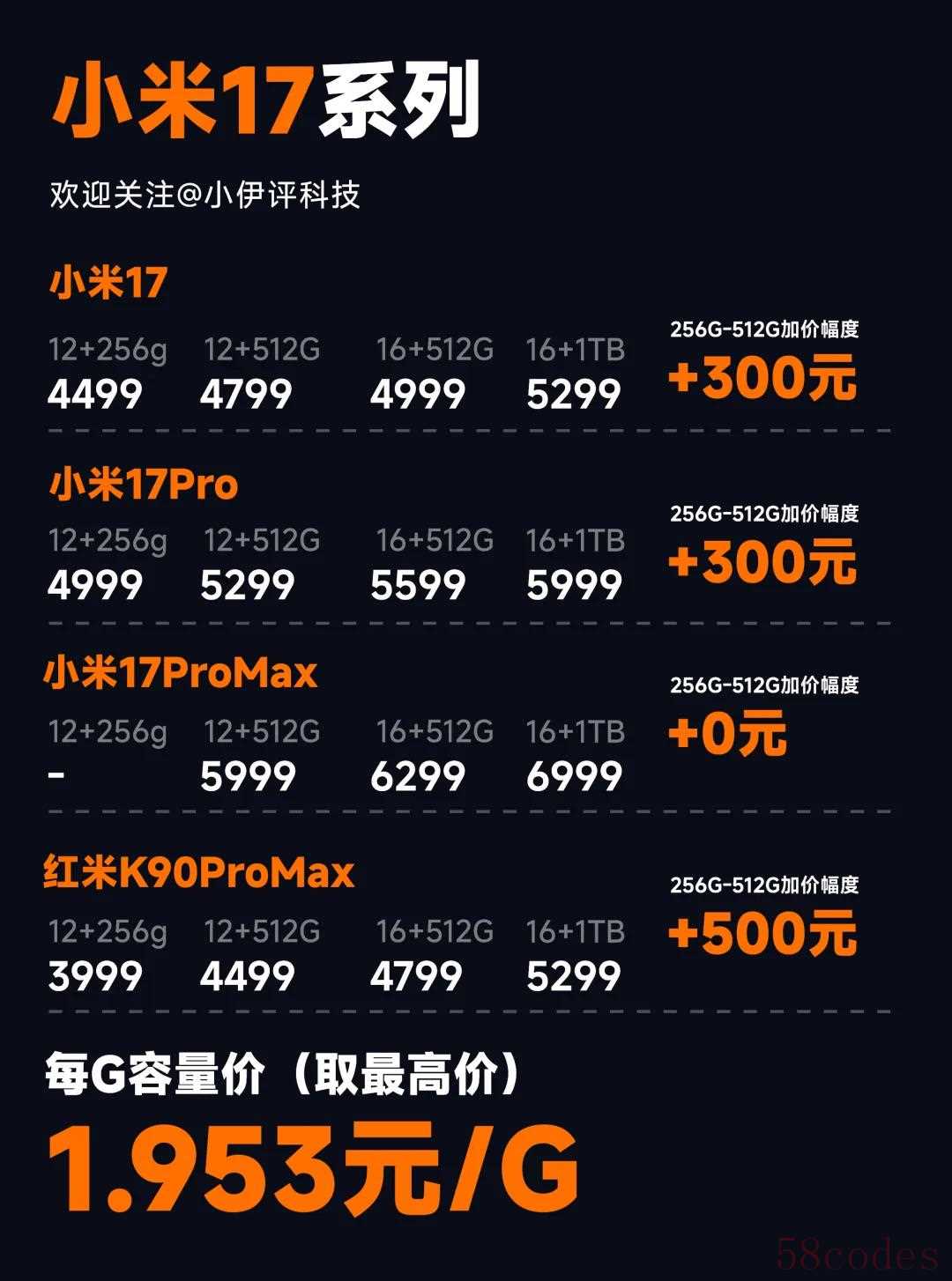 小米17这边,各版本之间的价格提升幅度相对较为温和,从256G到512G版的涨价幅度都在300元。(小米17ProMax直接就是512G起)