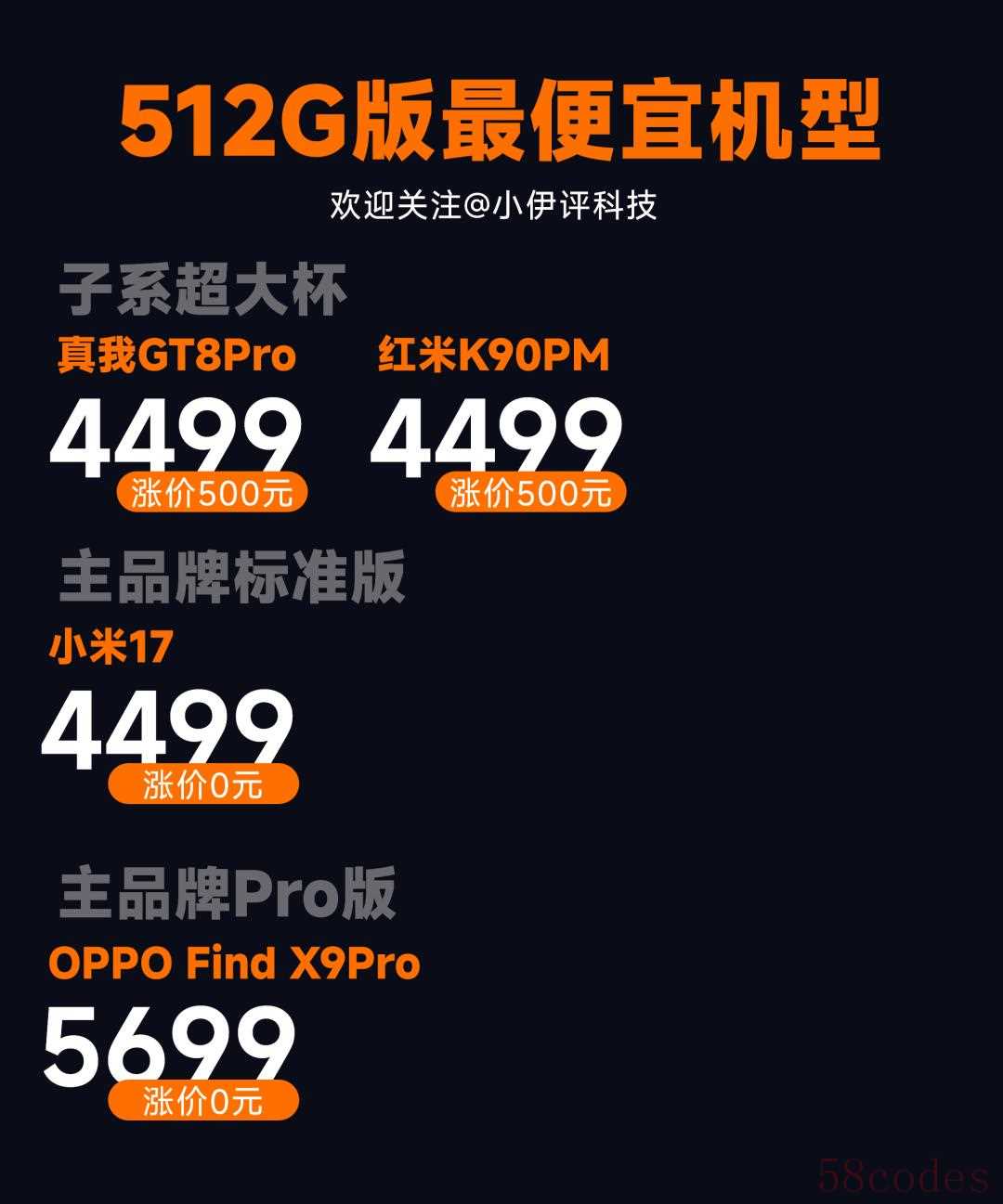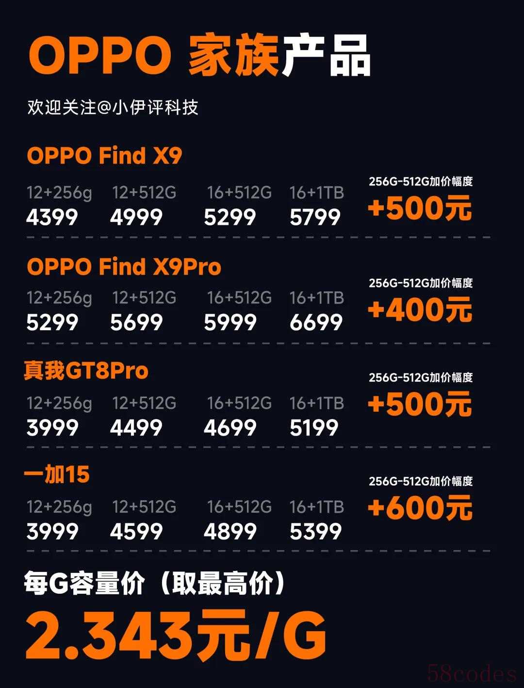 OPPO Find X9Pro这边,由于设定了一个12+512G的版本,所以显得会比较的温和,实际上从12+256G到16+512G的跨度也是700元。