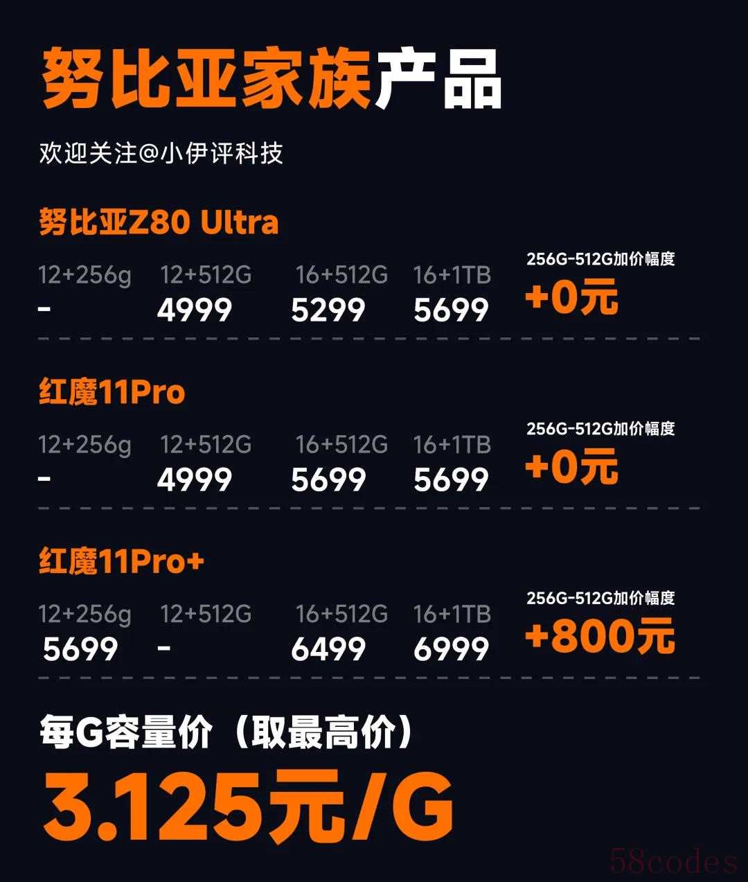 努比亚家这边,很有意思,定位最高的红魔11Pro+给了12+256G版,其他俩都是12+512G起步,而红魔11Pro+虽然给了256G版,但是从256G到512G的跨度达到了800元,国产里面No1的水平了。