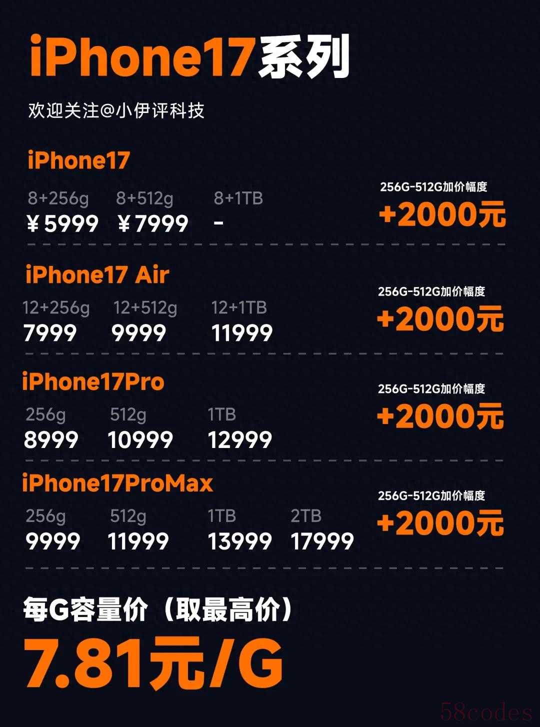 iPhone17系的内存价格真的堪比黄金,尤其是从256G到512G这个阶段,容量仅仅提升了256G,但是消费者却需要多付出2000块钱,平均下来每G容量的价格高达7.81元。