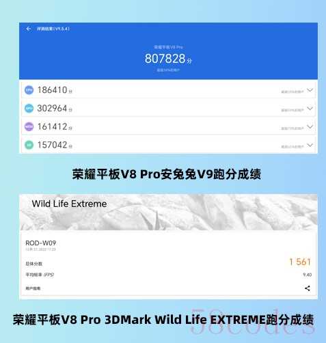 在实际的基准性能测试中,荣耀平板V8 Pro取得了安兔兔V9跑分807828分的成绩,符合预期;在3DMark Wild Life EXTREME测试中也取得了1561分的成绩,达到了同类平板的领先水平。