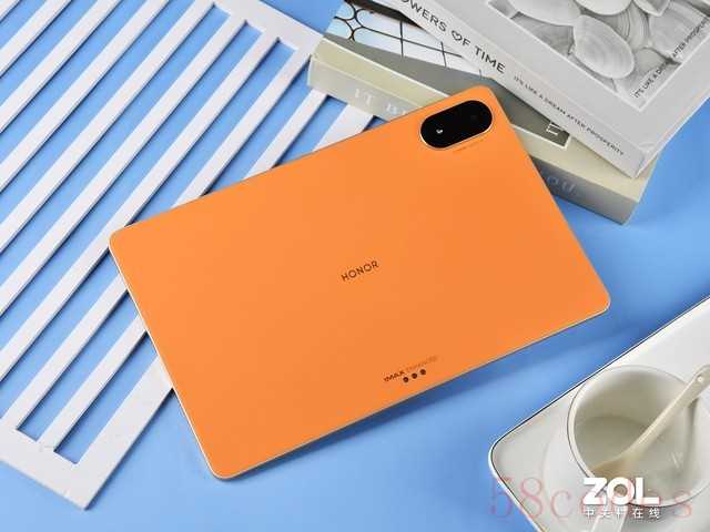 荣耀平板V8 Pro提供了星空灰配色和晴空蓝配色还有燃橙配色三种颜色可供用户选择,本次我们上手体验的是荣耀平板V8 Pro 燃橙配色版,这一版本的机身后盖具有皮革质感,触手自然亲肤,温润舒适。